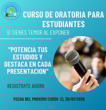 Nuestro curso de oratoria está diseñado para transformar tus nervios en seguridad y tus palabras en herramientas de persuasión. No importa si eres estudiante, profesional o emprendedor: quien sabe hablar, lidera.El miedo a hablar en público es el mayor freno para el creEl miedo a hablar en público es el mayor freno para el crecimiento profesional. En este programa, no solo aprenderás a "hablar bien", sino que dominarás la psicología detrás de una comunicación efectiva: